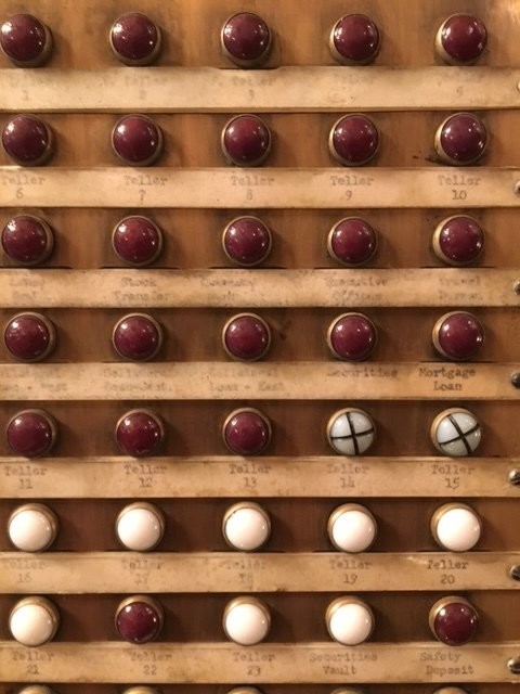 Teller cages were added within the historic hall, integrating mid-century banking functionality without compromising the building’s original architectural grandeur.